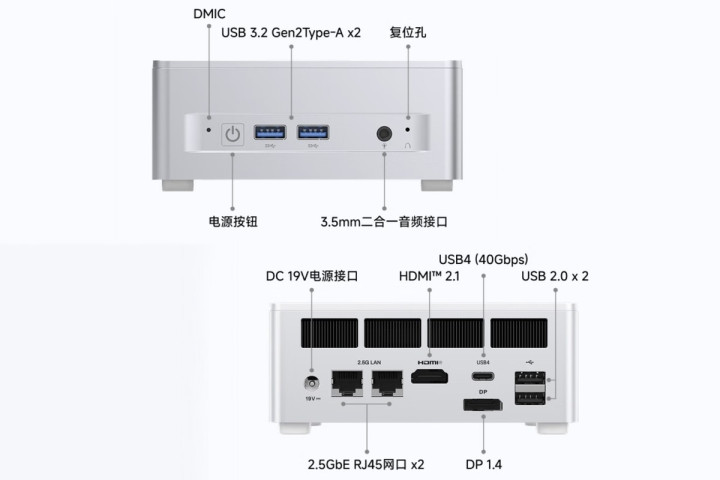 扩展接口这块,铭凡M1 Plus前面有2个USB3.2接口,后面有1个USB4、2个USB2.0和1个DP1.4、1个HDMI2.1、2个2.5Gb有线网口,在迷你主机里属于中规中矩、没什么特色也没短板的类型。