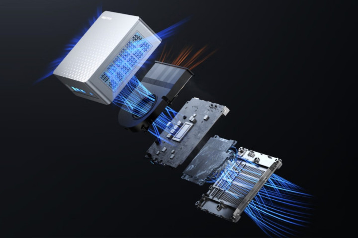 结构设计和硬件方面,铭凡M1 Plus采用了双风扇夹层的方案,上下各有一个风扇夹着中间的主板和内存、SSD等配件,而且都有各自独立的风道,散热效果应该不错,官方宣称性能释放可以达到65W。